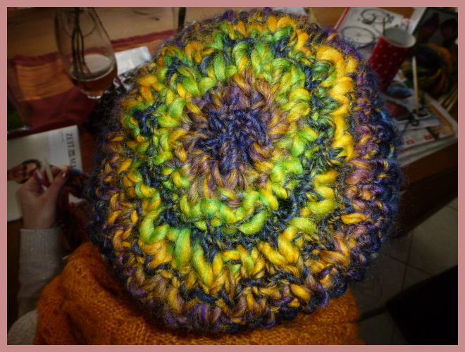 นั่งหน้าทีวีเมื่อคืนวานก็เริ่มถัก..knitting 44ลูกโซ่,แบ่ง 4 ไม้ถัก= 11 ลูกโซ่ ตอนจะขึ้นลายเพื่อจบ4ไม้ถักฮี่... นั่งลองผิดลองถูกกันพัก! แต่หมวกน่ะ ถักรอบแน่ๆ. ต้องถักหน้าคอมคะ ใช้ไฟโต๊ะ! ม่ายงั้นปวดตา