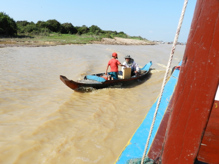 ขากลับเข้าฝั่ง .. เรือของเราตีคู่มากับเรือโดยสารสองลำ มองดูเห็นเป็นเด็กนักเรียน แต่งชุดลูกเสือ ผ้าพันคอ เป็นรูปปราสาทนครวัด .. เราก็เดาว่าเป็นเด็กนักเรียนกัมพูชามาทัศนศึกษา
