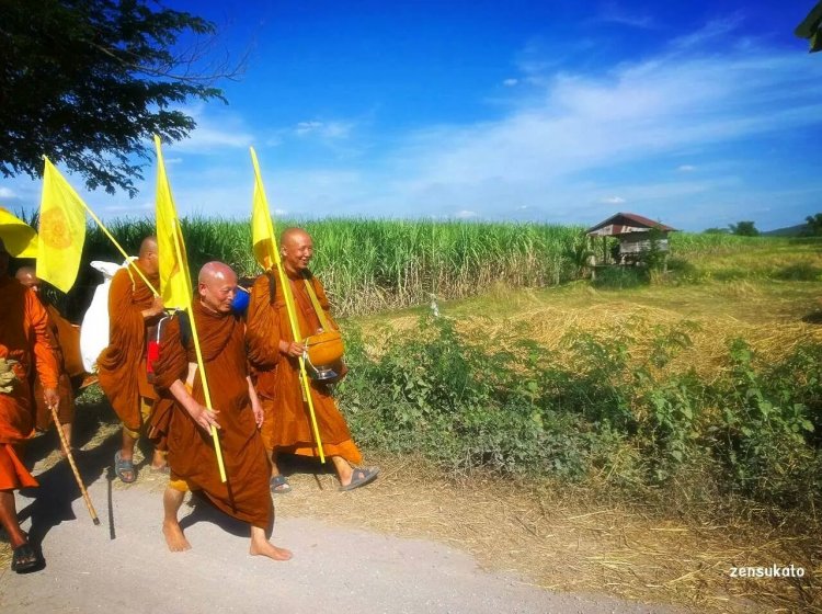 คณะธรรมยาตรา เดินผ่านป่าอ้อย รับประทานอาหารเพล ที่บ้านไฮ  ก่อนจะเดินเข้าไปในป่า