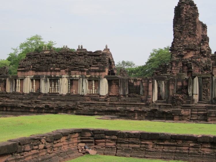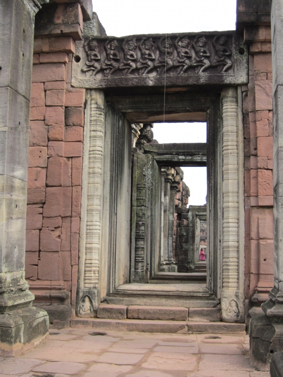 เดินผ่านประตูเข้ามาจะพบยอดปราสาท สามยอด  และสระน้ำสองด้าน