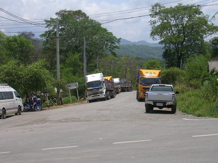 รถบรรทุกที่เห็น ไม่ได้จอดเรียงแถวเดียวน่ะครับเขาจอดซ้อน 3 แถว ไม่เช่นนั้น ยาวทะลุด่านไทยแน่นอน