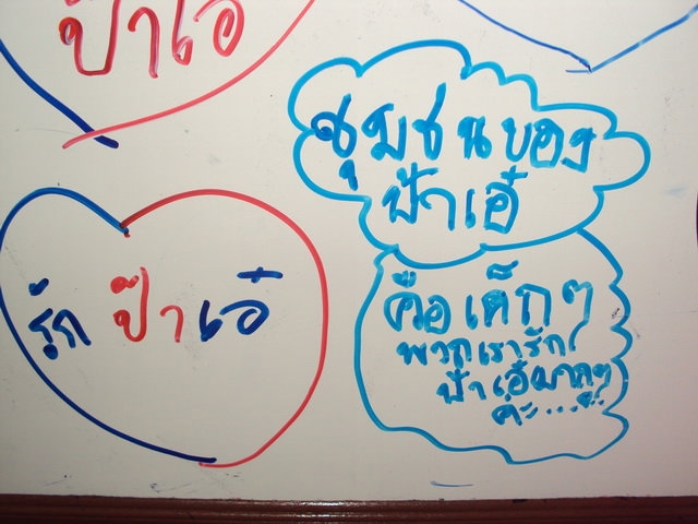 คนนี้มีคำว่าชุมชนด้วย..สงสัยเลยถามความรู้สึกที่เขียนออกมา คำตอบคืออยากให้ป้าเอ๋ เป็นนักการเมือง..จำได้ว่าถามต่อว่าทำไมล่ะ แต่จำคำตอบไม่ได้แล้วค่ะ..อืมม ป้าเอ๋เลย สรุปให้เด็กๆฟังว่า ป้าเอ๋มีความสุขกับการเป็นครูและเป็นพ.สมทบ ได้มาสอนพวกหนูและ ยังมีโอกาสทำประโยชน์อื่นๆได้มากมายเช่นกันนะคะ..