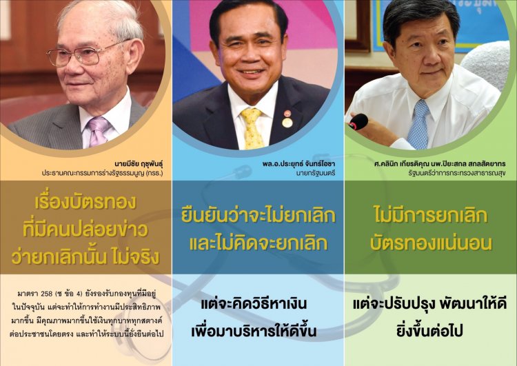 พวกไม่หวังดีต่อประเทศชาติ ออกข่าวว่า รัฐบาล จะล้มบัตรทอง  มันไม่เป็นความจริงครับ เพราะเขาเขียนเอาไว้ในรัฐธรรมนูญ